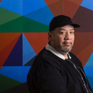 Jeffrey Gibson (b. 1972, Colorado Springs, Colorado; lives and works in New York State) grew up in major urban centers in the United States, Germany, Korea, and England. A mid-career multidisciplinary artist, he is a citizen of the Mississippi Band of Choctaw Indians and is half Cherokee. He incorporates this heritage into his work, which includes sculptures, paintings, prints, and video. Gibson earned his M.A. in painting at the Royal College of Art, London, in 1998 and his B.F.A. in painting from the School of the Art Institute of Chicago in 1995. He has worked in the permanent collections of the Denver Art Museum; National Museum of the American Indian; National Gallery of Canada; Crystal Bridges Museum of American Art; the Museum of Fine Arts, Boston; and the Mississippi Museum of Art; among others. Gibson is a member of the faculty at Bard College, a past TED Foundation Fellow, and a Joan Mitchell Grant recipient.