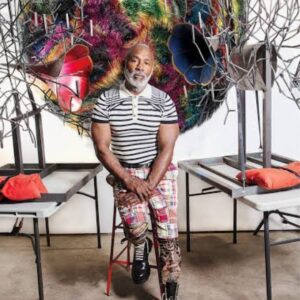 Nick Cave (b. 1959, Fulton, MO) is an artist, educator, and foremost a messenger, working between the visual and performing arts through a wide range of mediums including sculpture, installation, video, sound, and performance. Cave is well known for his Soundsuits, sculptural forms based on the scale of his body, initially created in direct response to the police beating of Rodney King in 1991. Soundsuits camouflage the body, masking and creating a second skin that conceals race, gender, and class, forcing the viewer to look without judgment. They serve as a visual embodiment of social justice that represent both brutality and empowerment.