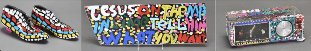 - V. Hull (1942–2008), Untitled, 2004. Acrylic paint on shoes, 5 x 3.5 x 11 inches. Courtesy of the Estate of L.V. Hull, Arts Foundation of Kosciusko. Gift of Kohler Foundation, Inc.